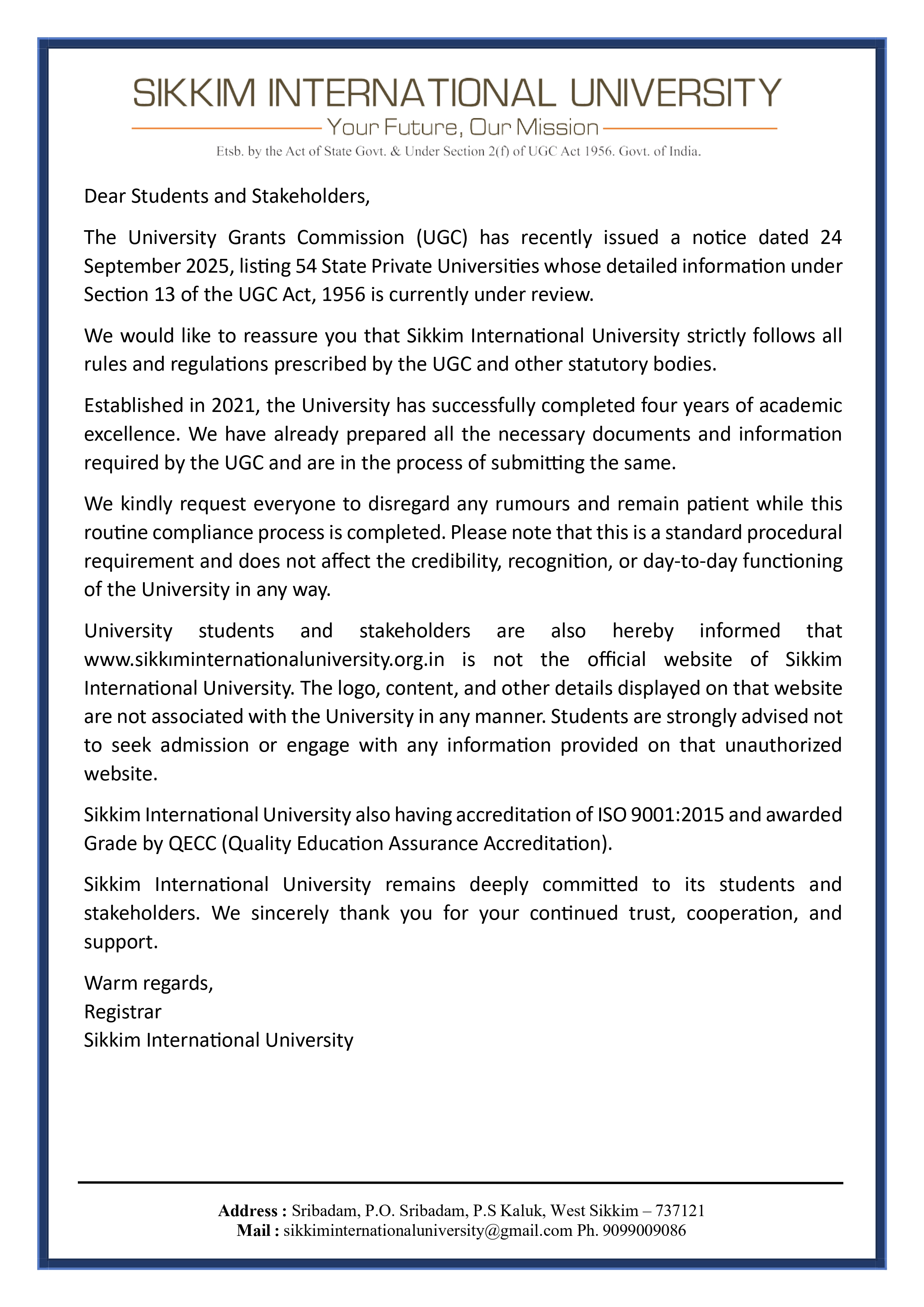 Sikkim International University aims to provide quality education to our students, shape a brighter career for them thus providing a great employment opportunity to build a better society economically and socially. The University will transform lives and serve society by educating, creating knowledge and putting knowledge to work on a large scale with excellence.